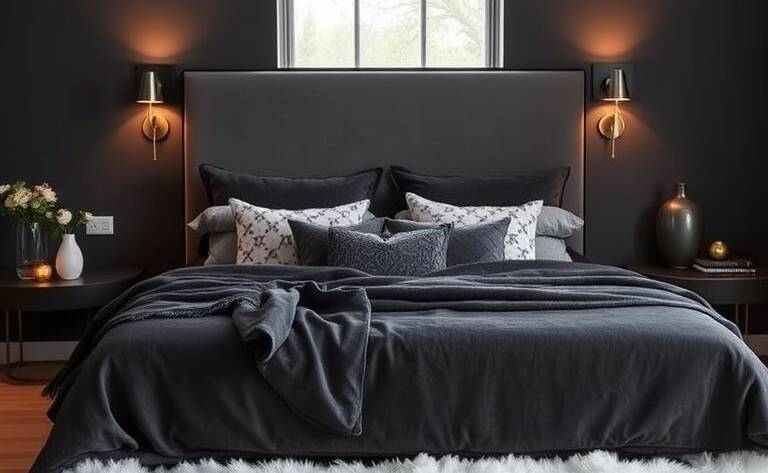 Thinking about my bedroom makeover, I learned something important. A headboard in dark grey or charcoal can change everything. It brings elegance and sophistication to your space.