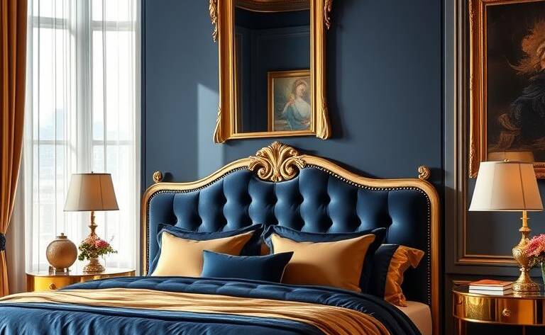 I love the elegance of navy blue and gold colors. They can make any bedroom feel more sophisticated.