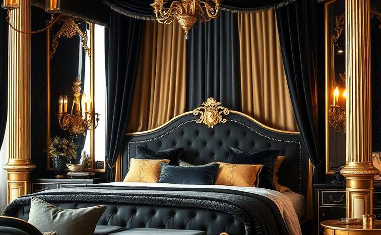 I still remember walking into my first luxury hotel room. I was amazed by the luxurious bedroom ideas around me. The mix of black and gold decor was both classy and welcoming.
