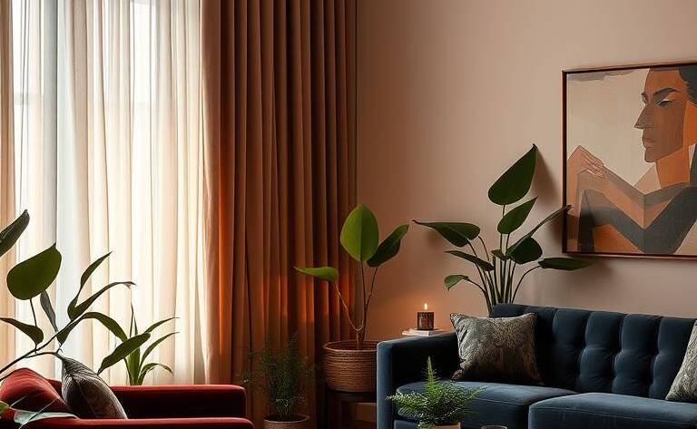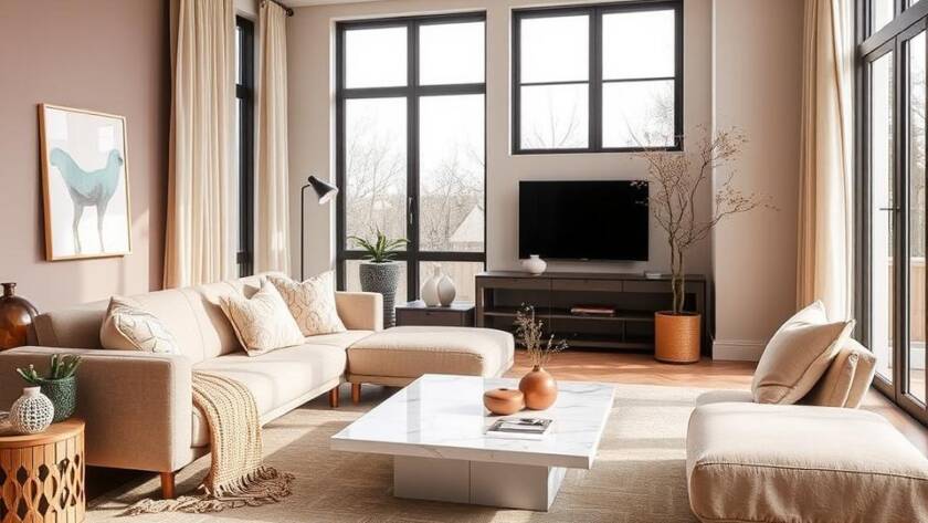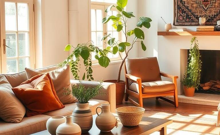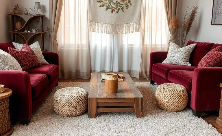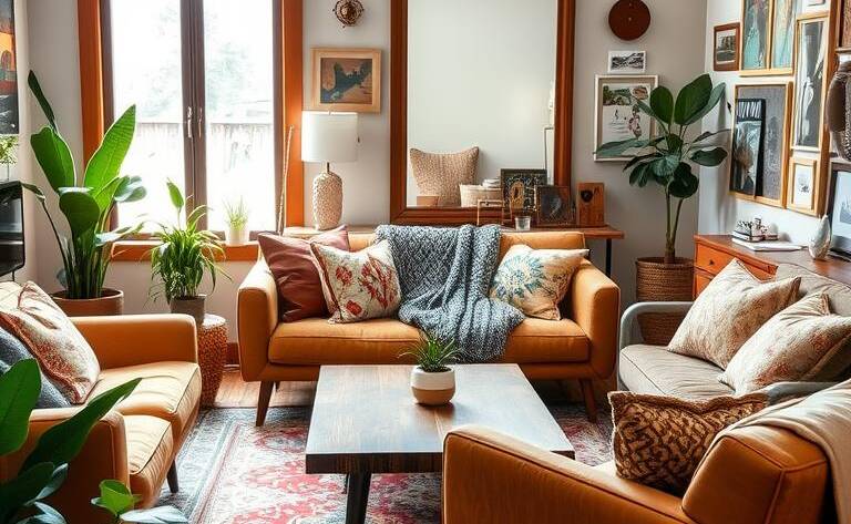 Thinking about making a cozy living space reminds me of mixing styles. Blending bohemian and mid-century modern elements makes a space feel both warm and fancy.
