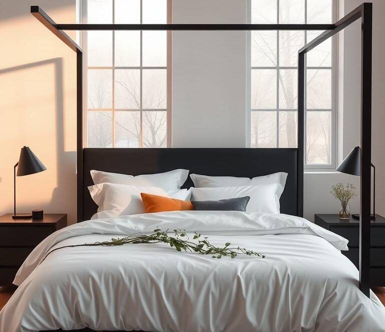 For a modern furniture look, pick a simple color scheme. Add pops of color with throw pillows and blankets. This makes your bedroom cozy and stylish.