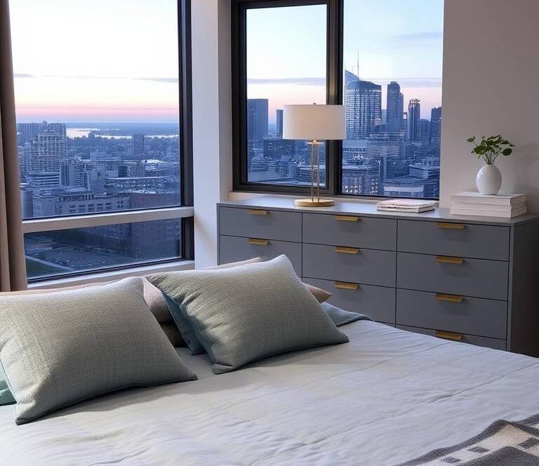 Cove lighting makes your bedroom fancy. It uses LED strip lights around the ceiling. This lighting is also good for saving energy and is easy to control.