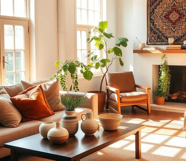 Using plants and wood accents makes your living room cozy. It feels like it’s connected to nature. This is great in tiny houses where space is tight.
