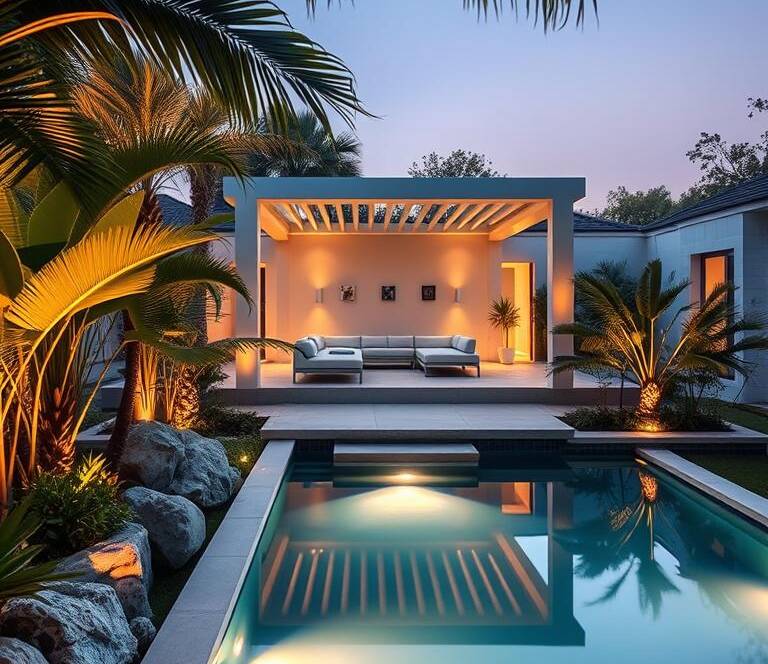 Unique water features, like a sleek waterfall or a fountain, can make your pool stand out. Adding custom lighting can make these features shine and create a cozy feel at night.