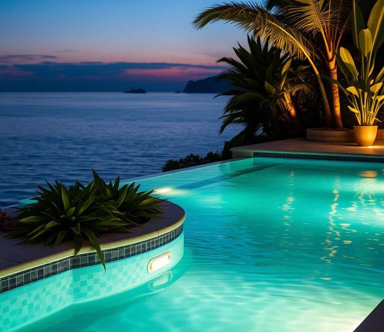 Underwater lights can make your pool look amazing. They come in many colors and can change colors or patterns. This creates a special look.