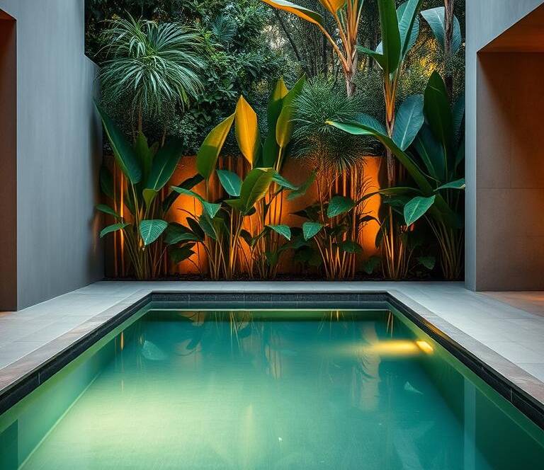 Plants around your pool bring colors and a natural feel. Choosing the right plants is key. They must do well in the pool area’s conditions, like water splashes and changing sunlight.