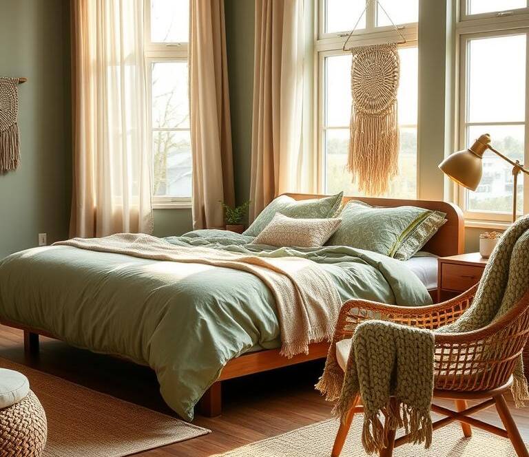 Cozy textures like woven baskets and chunky throws add warmth in fall. They make your bedroom snug and inviting. It’s great for the cooler months.